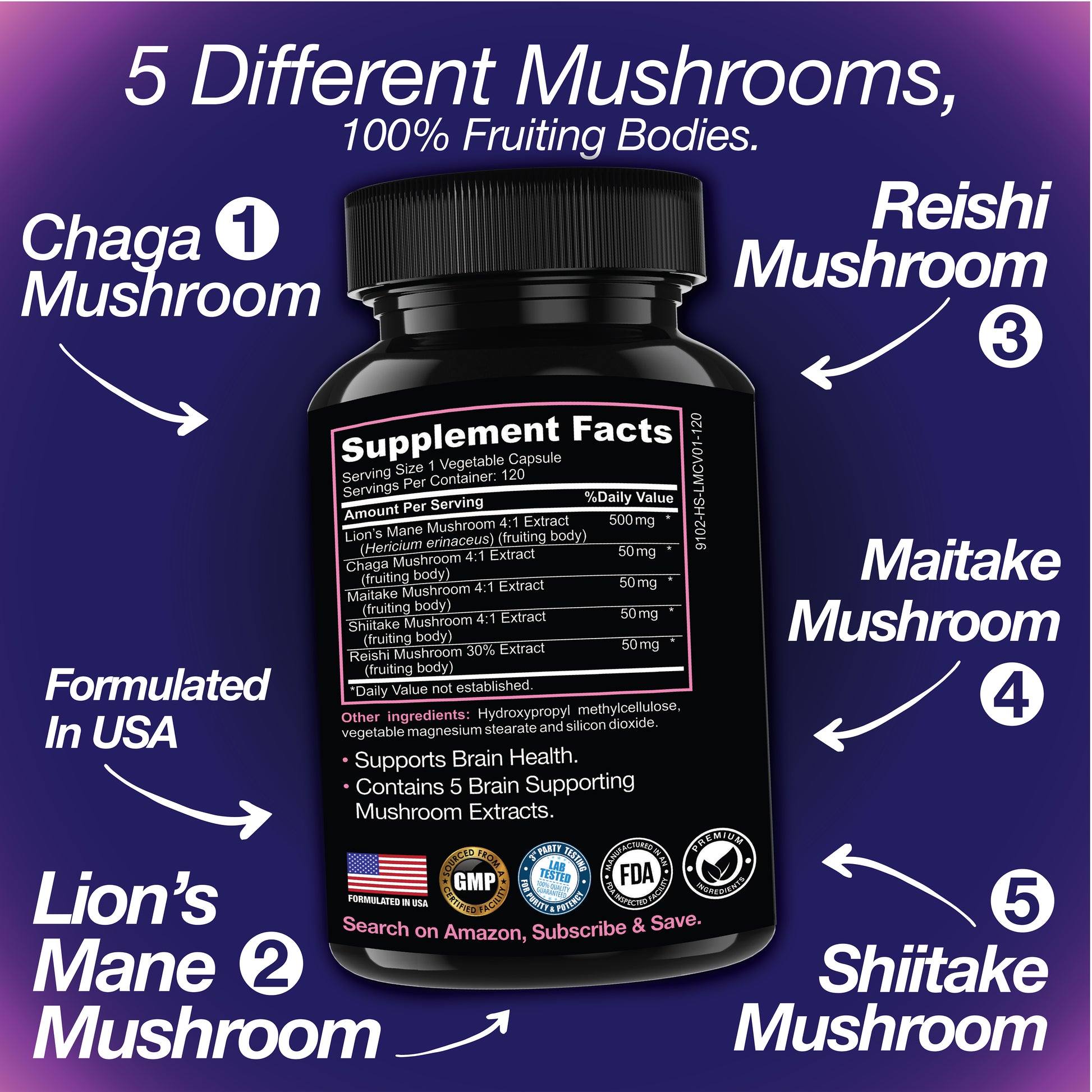 Lion’s Mane (Hericium Erinaceus), Chaga Mushroom, Maitake Mushroom, Shiitake Mushroom, Reishi Mushroom, (Fruiting Bodies).